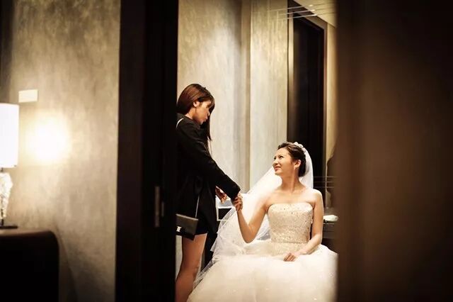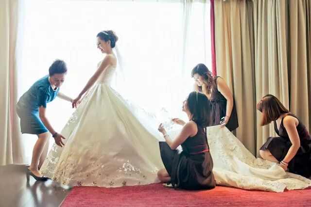 如下图,拍摄新娘穿戴婚纱的过程时,摄影师并没有着重展现婚纱的华美,而是把重点放在闺蜜为新娘穿戴的细节上。